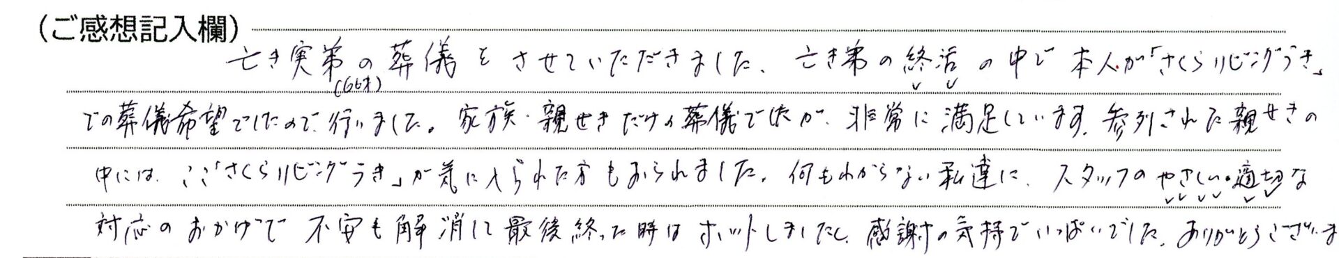 スタッフより | Y様、この度はアンケートへご回答頂きありがとうございます。大切な弟様との最後のお別れの場にさくらリビングうきをお選び頂きまして、誠にありがとうございました。ご葬儀をされるにあたってご不安なことも多くあられたかと存じますが、当社スタッフが少しでもY様方のお役に立てたのであれば幸いでございます。お忙しいところ貴重なご意見をいただき、ありがとうございました。 |
